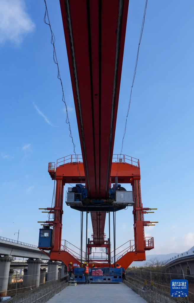 这是2月3日拍摄的渝昆高铁最后一榀箱梁架设施工现场。