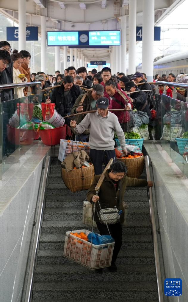 2月12日,在贵州省铜仁市铜仁火车站,村民挑着蔬果出站。