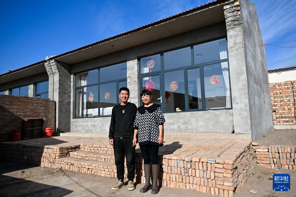 2月12日,村民张瑞军(左)与妻子武红利在新房前合影。为避免房屋遭遇水淹,政府部门在帮扶建设新房时将房屋地基抬高了约50厘米。
