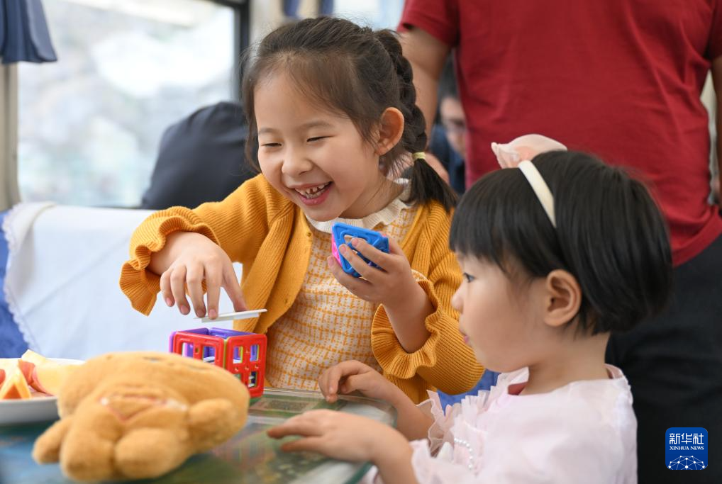 2月15日,儿童旅客在列车上的“童趣空间”玩耍。