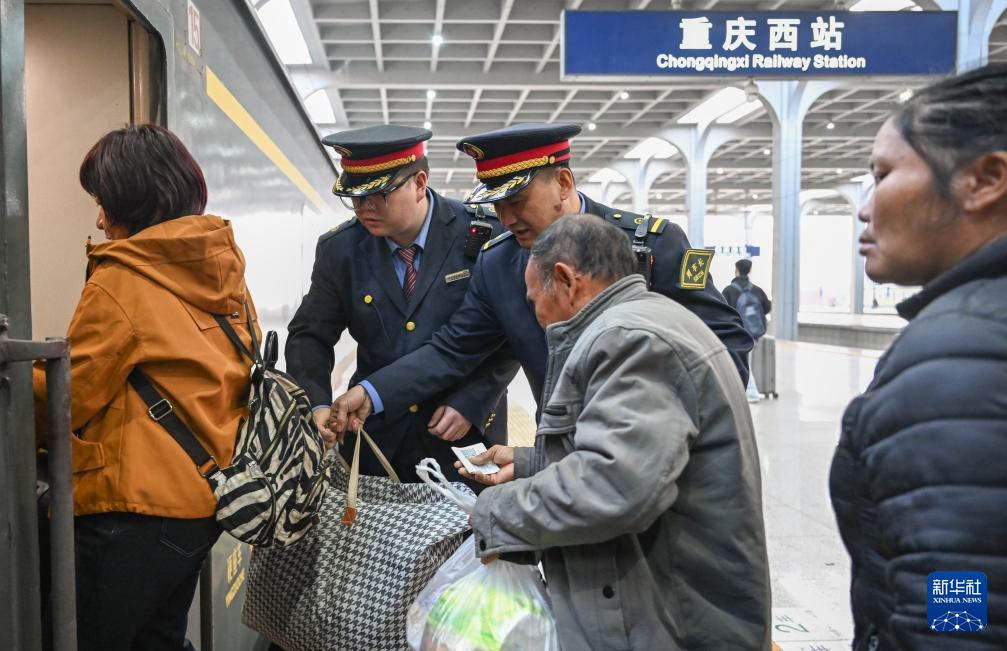 2月15日,列车员在重庆西站协助旅客搬运大件行李。