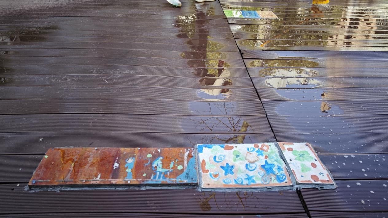 张秀丽:像这些地板坏了都是交给孩子们修补,在上面画的画,我们教他们修。