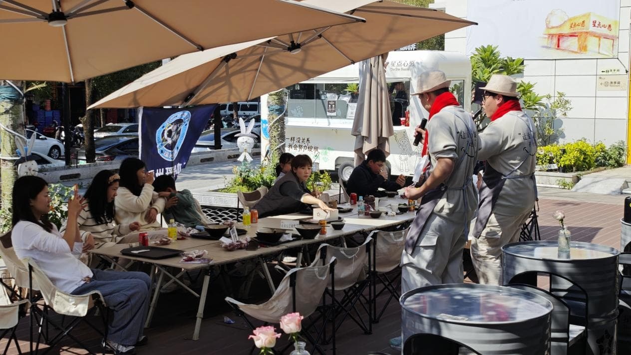 忙完店内的工作,嘉禾和旺旺仔跑到店外,拿着便携麦克风给来团建的足球队唱起了小虎队的《爱》,他们很喜欢唱歌,也喜欢听到大家的鼓励。