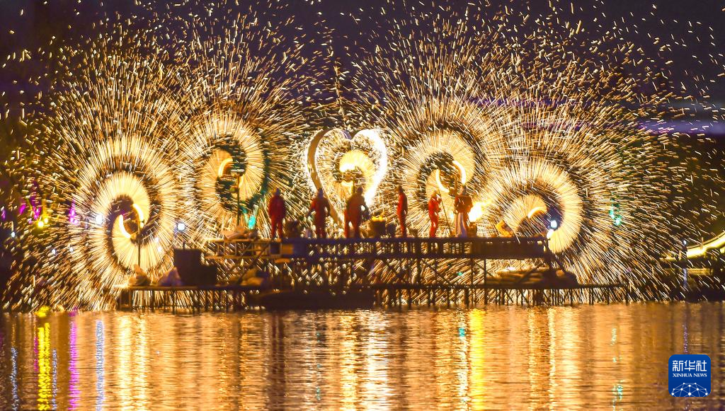 这是2月17日在河南省洛阳市隋唐城遗址植物园“神都上元灯会”上拍摄的水上打铁花表演。