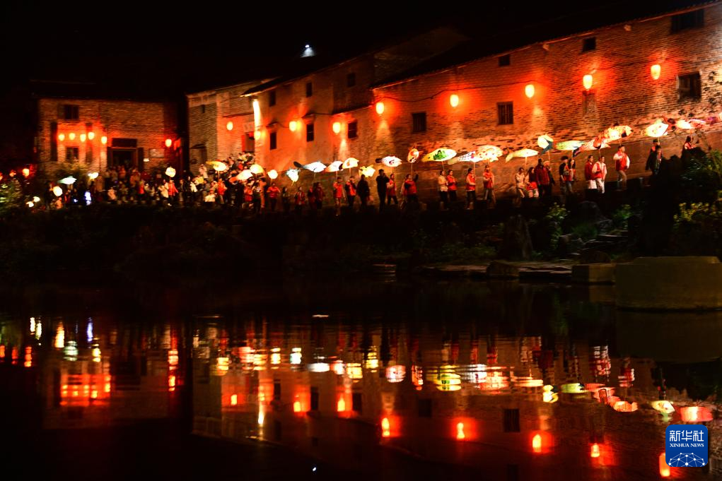2月18日,人们高举鱼龙灯在广西贺州昭平县黄姚古镇老街游行。