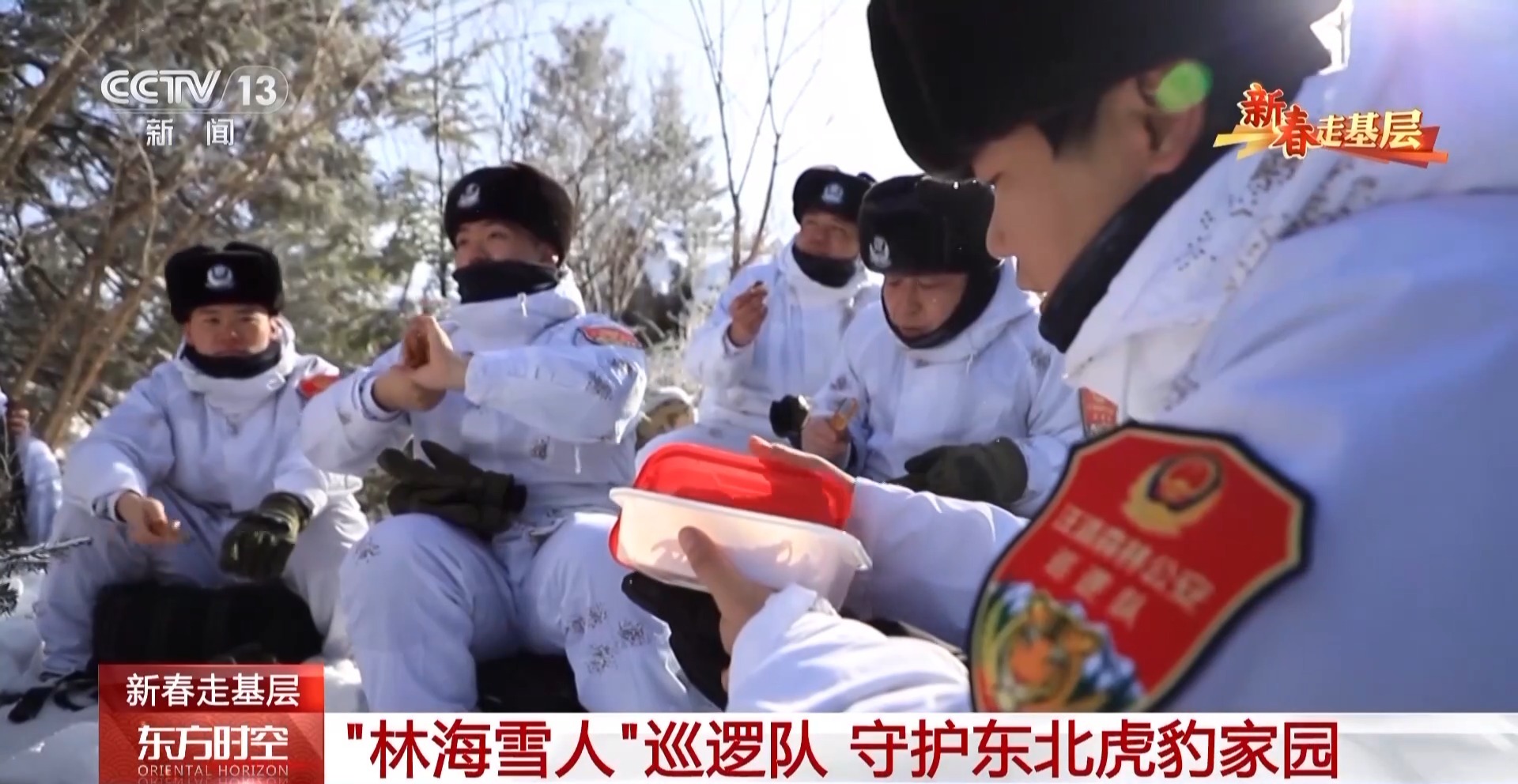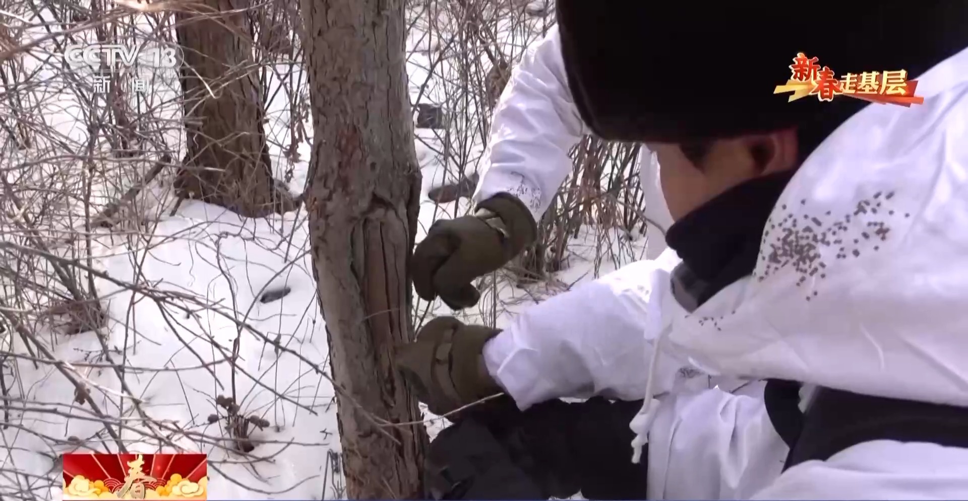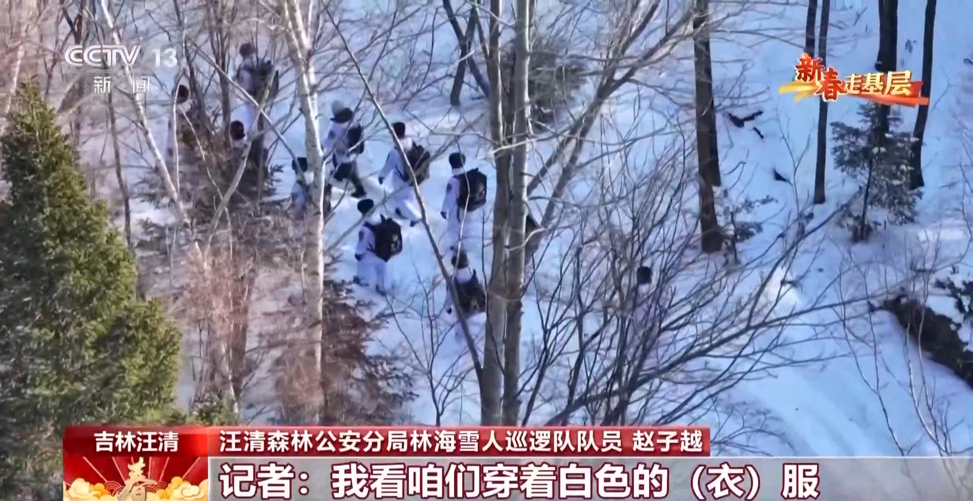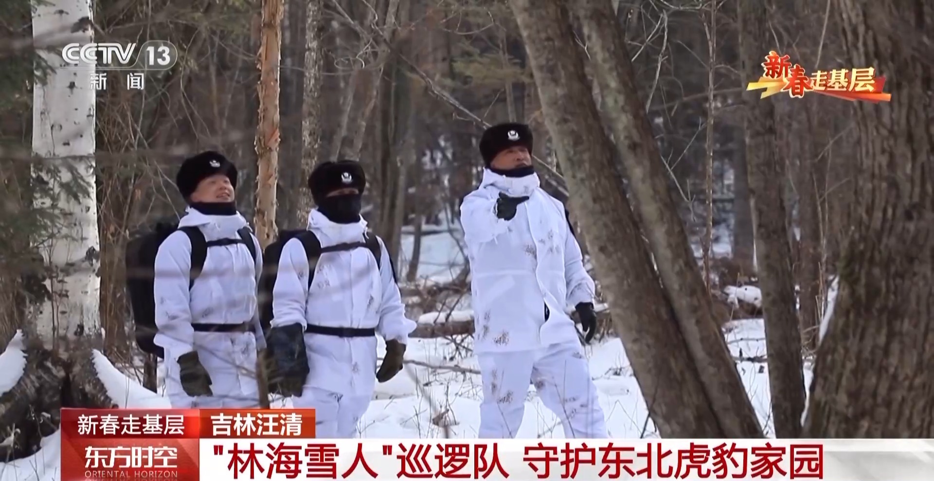 汪清森林公安分局林海雪人巡逻队队员赵子越:这是一个隐蔽服,更好地让我们在雪地中隐蔽起来。这样野生动物,比如老虎、豹发现我们的可能性也会小一些。