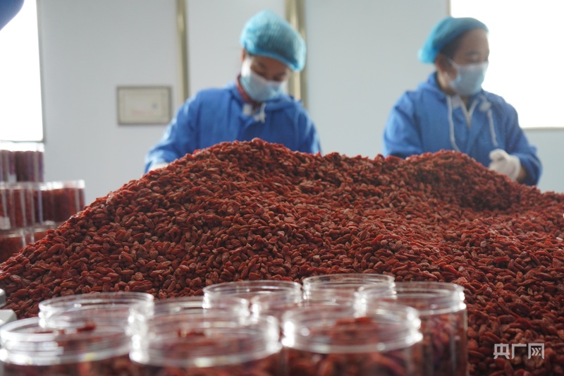 企业生产车间内,鲜红的枸杞正在打包装箱(央广网记者 汪晓青摄)