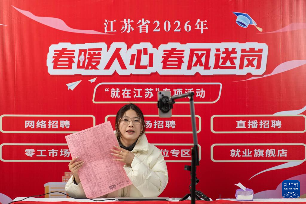 2月24日,在江苏省泰州市海陵区举办的2026年“春风送岗就在海陵”专场招聘会上,工作人员利用直播平台推荐岗位信息。