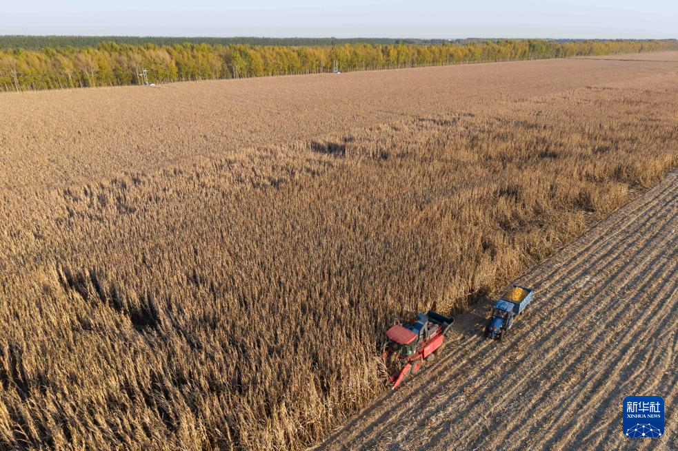 2025年10月13日,在黑龙江省肇东市五里明镇东升村应用中国农业大学肇东实验站集成“大垄双行密植+水肥一体化+秸秆粉碎深埋”技术模式的试验田里,当地农机专业合作社的农民在收获玉米(无人机照片)。
