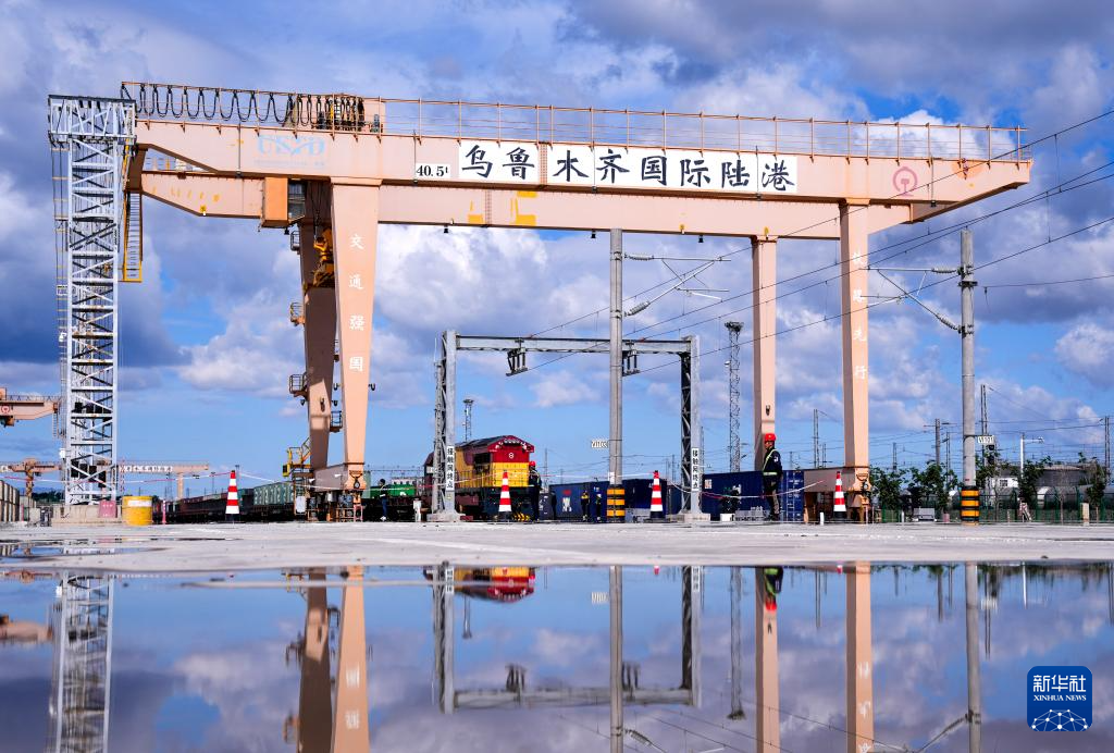 在新疆乌鲁木齐国际陆港区,一列满载货物的中欧班列即将驶离(2024年5月27日摄)。