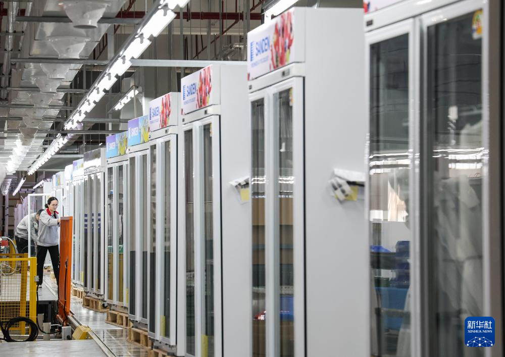 在西科冷链广东江门制造基地的产线上,工人对一批出口海外的商用冷柜进行外观检查(2025年3月22日摄)。
