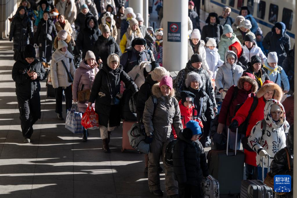 2026年1月8日,在绥芬河火车站,游客下车出站。黑龙江省绥芬河市是中俄重要陆路口岸城市。随着中俄双向免签政策实施,当地以高效便捷的通关服务,提升口岸人员和贸易往来效率,带动两国人文和旅游交流。