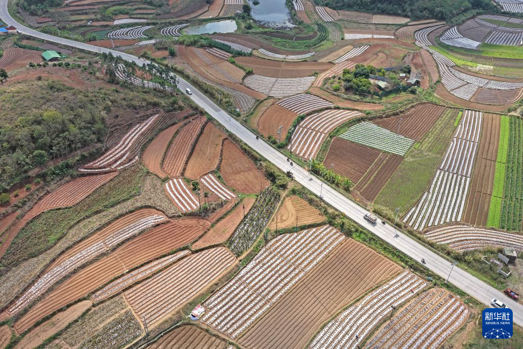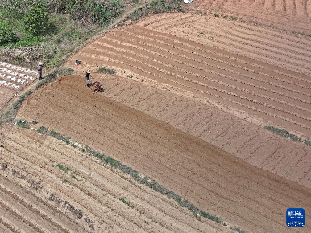 3月1日,村民在广西南宁市邕宁区蒲庙镇田园里耕作(无人机照片)。