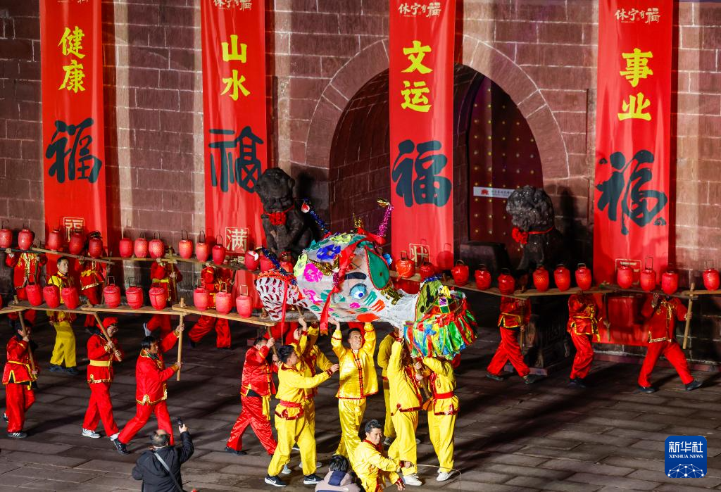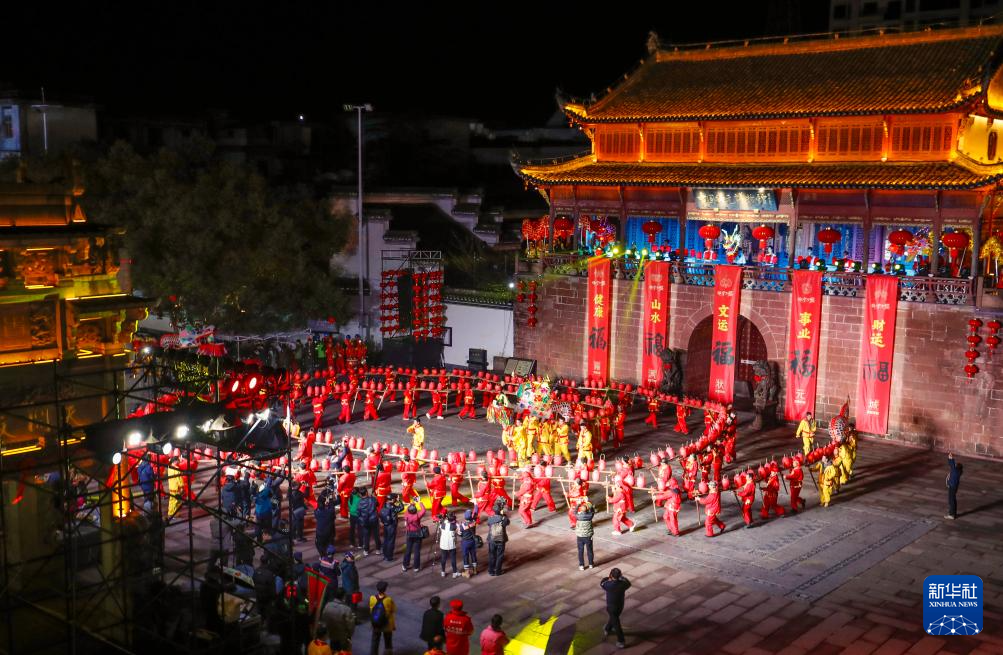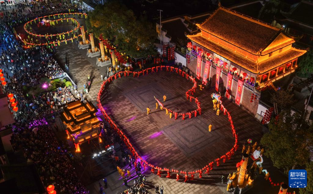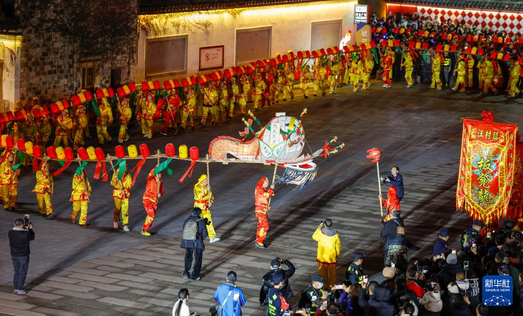 农历正月十二,安徽省黄山市休宁县“福满状元城”舞龙大会在状元广场热闹开演。百米长的非遗民俗徽州板凳龙在街巷间穿梭游动,与钟鼓楼相映成辉,喜迎元宵佳节。