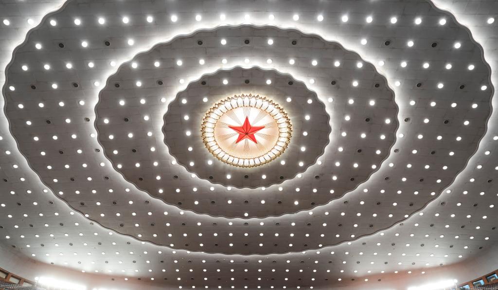 3月5日,十四届全国人大四次会议开幕会即将在北京人民大会堂举行。这是人民大会堂内景。