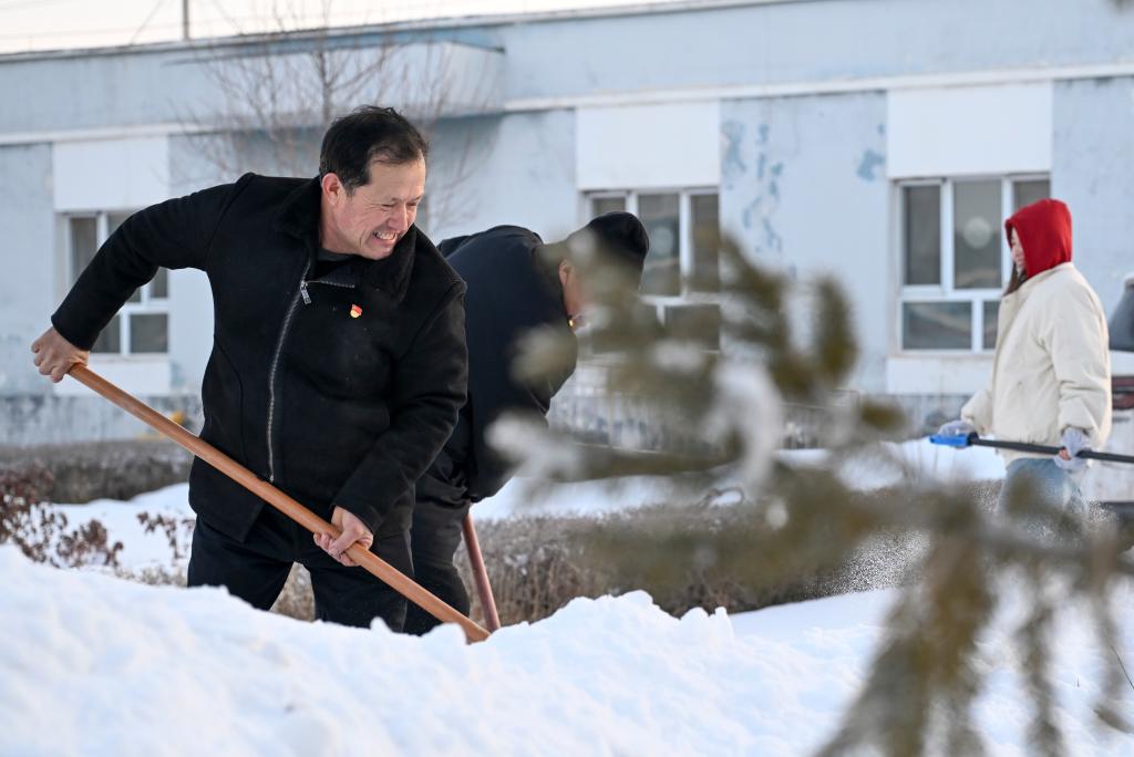2月9日,在新疆伊犁哈萨克自治州新源县,全国人大代表木沙江·海拉特(前)在克热格塔斯村党群服务中心和当地干部一起清理积雪。