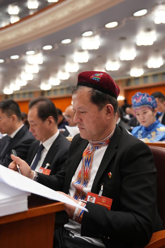 3月5日,全国人大代表木沙江·海拉特出席十四届全国人大四次会议开幕会。