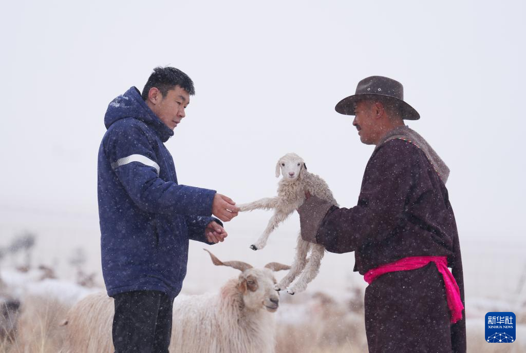 3月8日,在青海省海北藏族自治州祁连县阿柔乡草大板村,阿柔乡畜牧兽医站工作人员布银达拉(左)在查看东宝家转场来的羊羔。