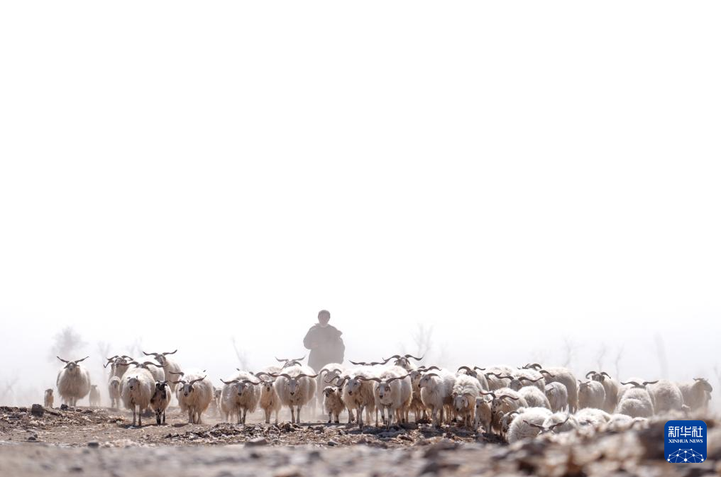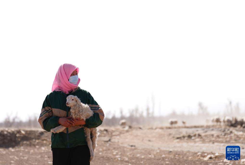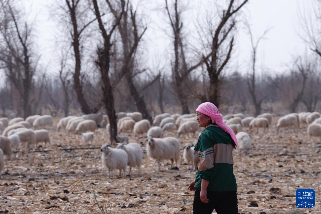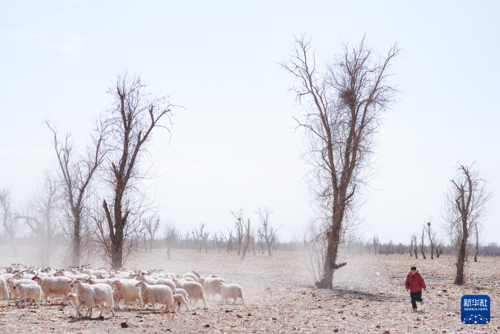 3月7日,在甘肃省张掖市甘州区碱滩镇二坝村的借牧点,东宝的儿媳拉中在放牧。