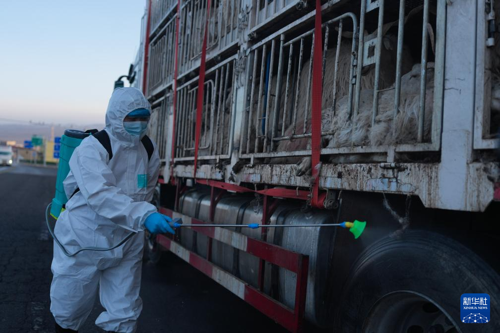 3月7日,在青海省峨堡公路动物卫生监督检查站,工作人员在对转运车辆进行消毒。