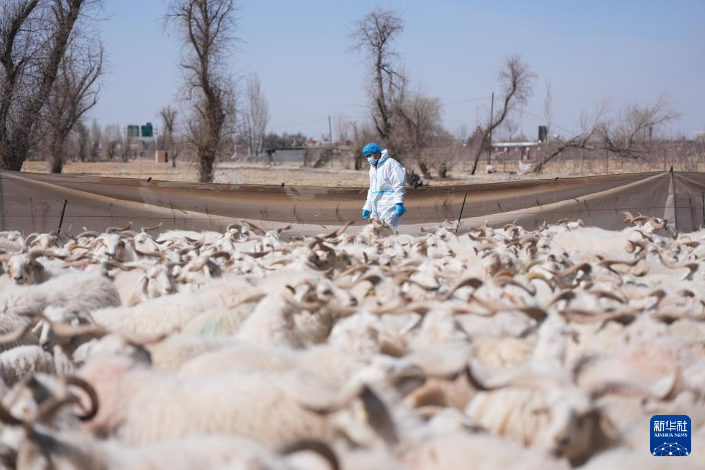 3月7日,在甘肃省张掖市甘州区碱滩镇二坝村的借牧点,祁连县农牧部门专业技术人员对返场装车前的羊群进行健康检查。