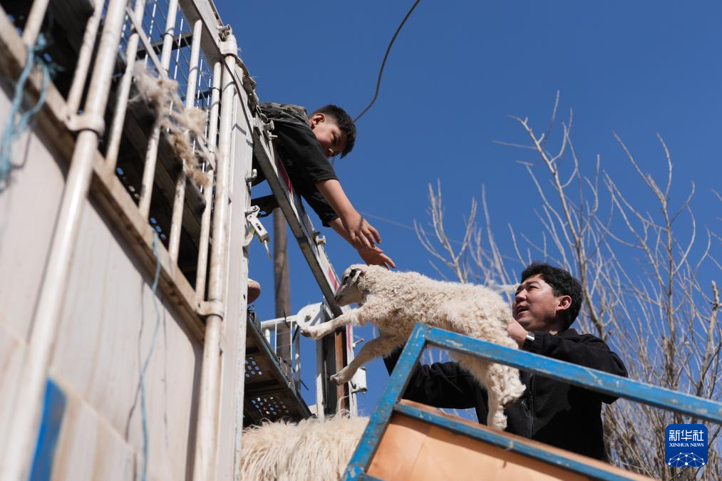 3月7日,在甘肃省张掖市甘州区碱滩镇二坝村,东宝的儿媳拉中抱着一只刚出生的小羊羔走向车辆转运点。