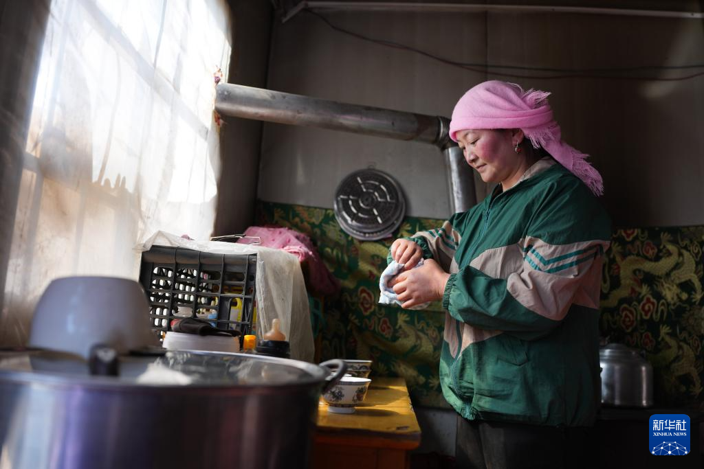 3月7日,在甘肃省张掖市甘州区碱滩镇二坝村的借牧点,东宝的儿媳拉中在临时居住的简易板房内做家务。