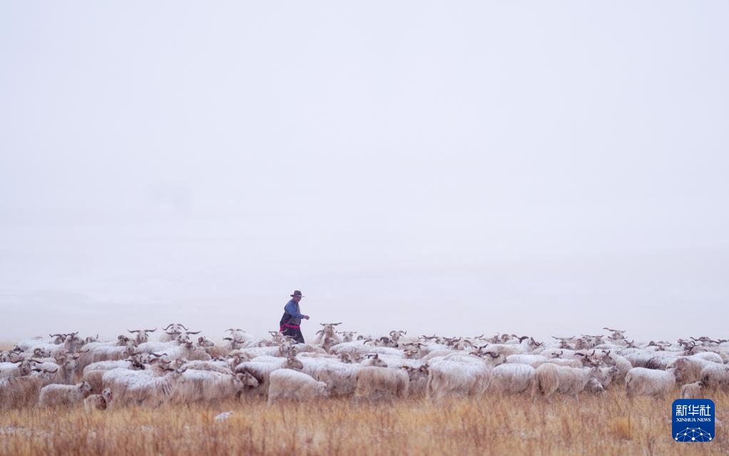 3月8日,在青海省海北藏族自治州祁连县阿柔乡草大板村,牧民东宝在草原上放牧。