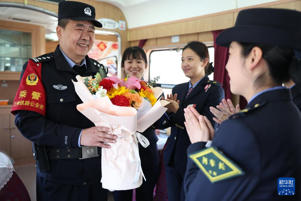 3月11日,列车工作人员在兰州开往上海的T118次列车上向最后一次值乘的兰州铁路公安处乘警支队民警段文革(左一)献花并送上祝福。