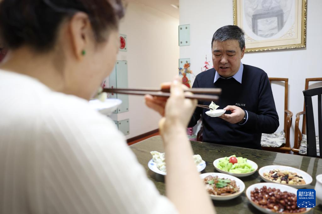 3月11日,兰州铁路公安处乘警支队民警段文革(右)在最后一次值乘前与妻子王春兰在家里吃饺子。