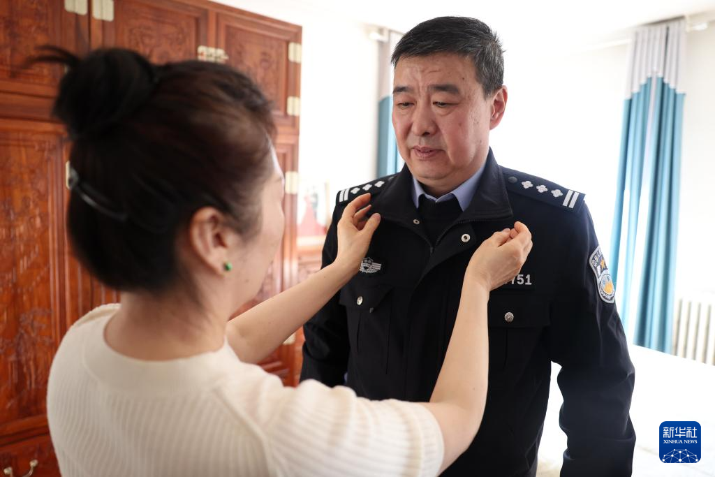 最后一次值乘前,妻子王春兰(左)为段文革整理警服(3月11日摄)。