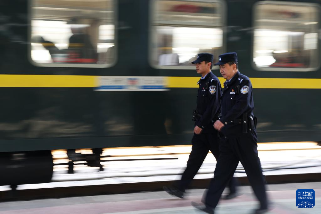 3月11日,兰州铁路公安处乘警支队民警段文革(右)和王岳宁在列车开车前巡查。