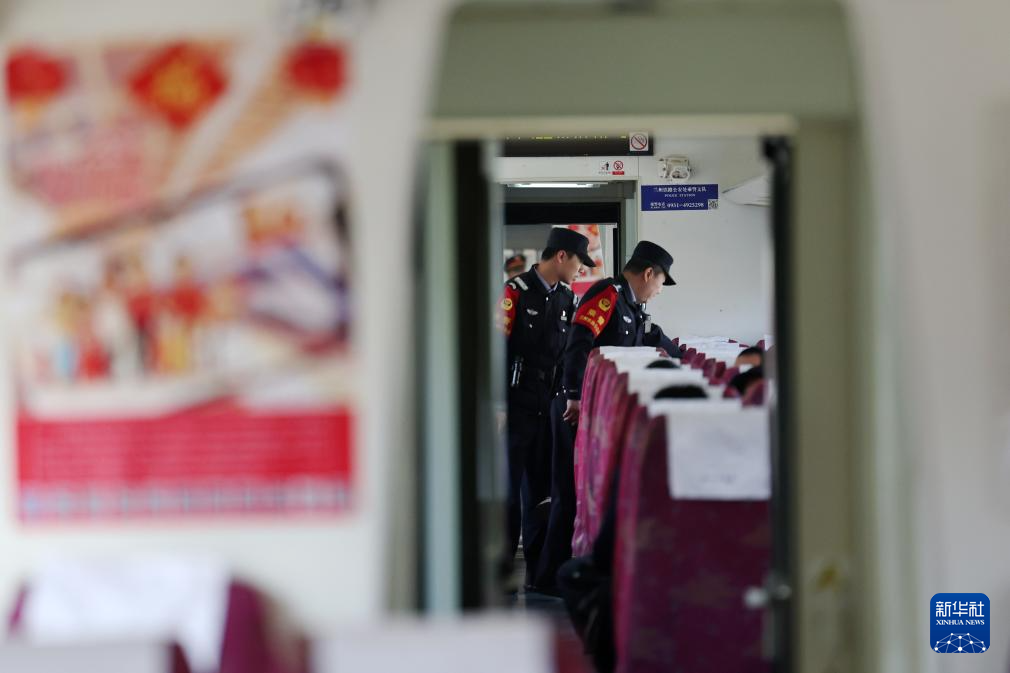 3月11日,兰州铁路公安处乘警支队民警段文革(前)在兰州开往上海的T118次列车上巡查。