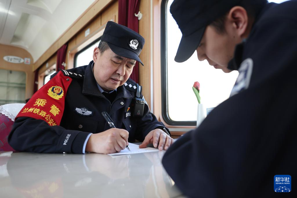 3月11日,兰州铁路公安处乘警支队民警段文革(左)在兰州开往上海的T118次列车上填写工作日志。