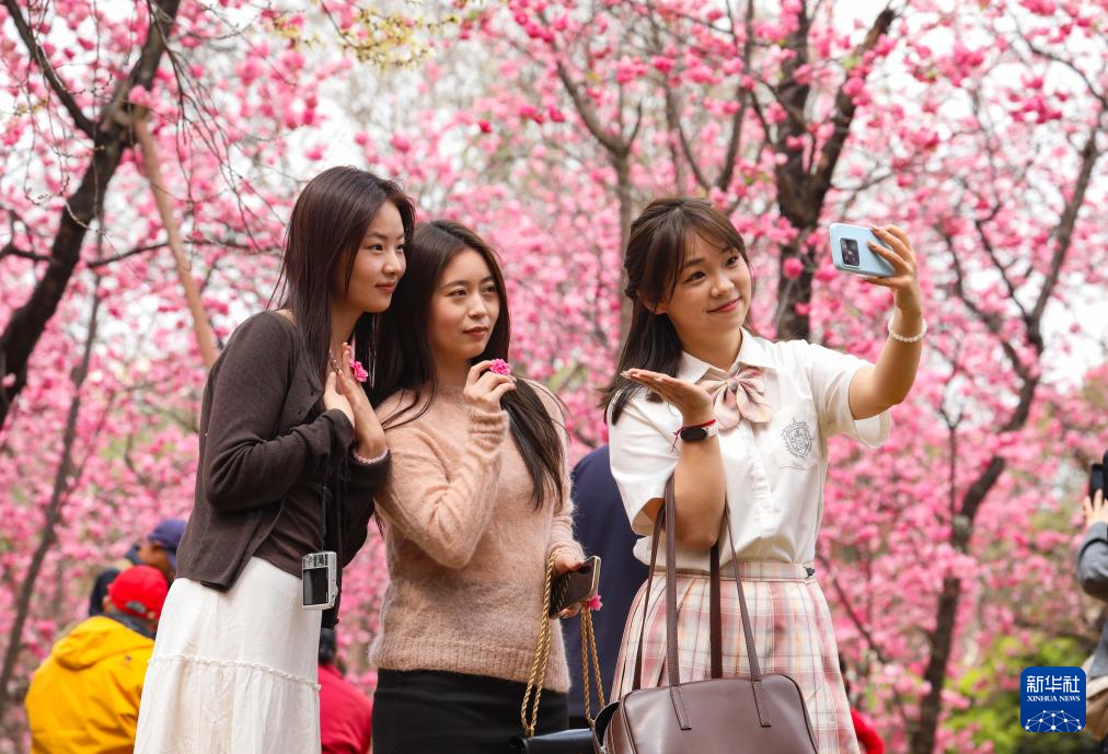 3月8日,游客在江苏省南京市朝天宫景区赏花拍照。