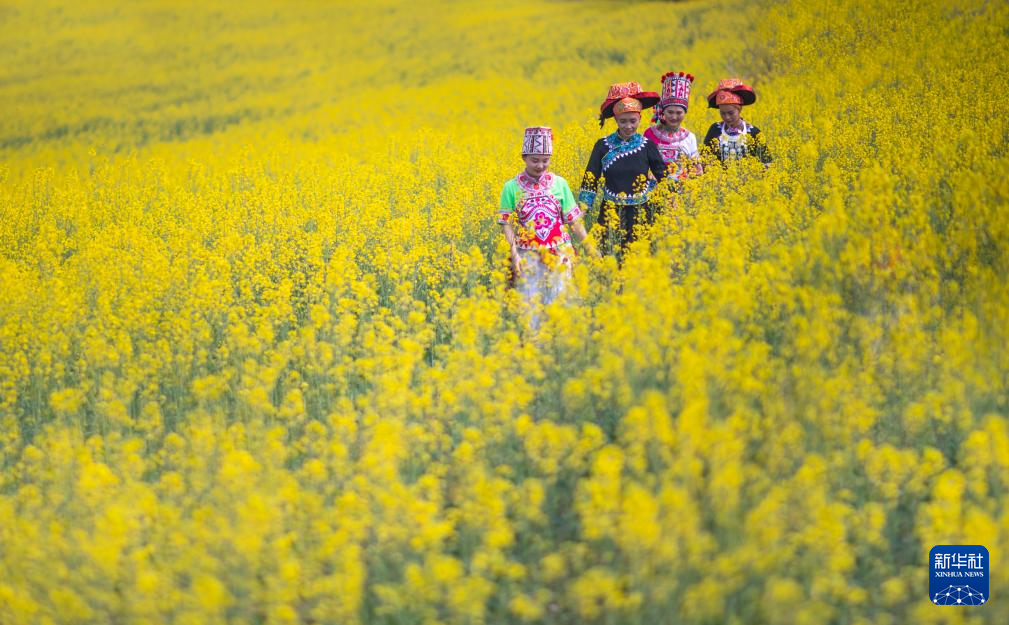 3月8日,人们在云南省文山壮族苗族自治州砚山县阿猛镇下科木村油菜花田游玩。