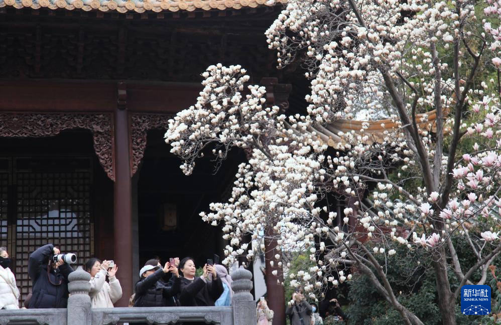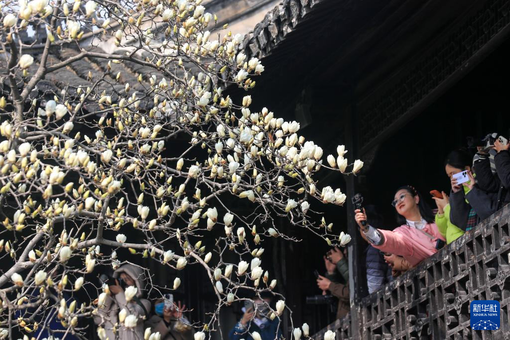 3月8日,游客在江苏扬州何园景区欣赏玉兰花。