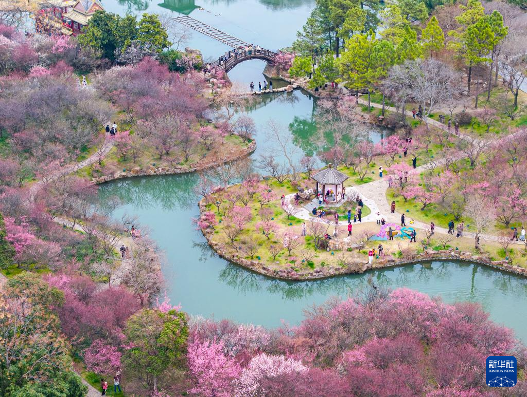 3月7日,游客在南京中山植物园赏樱游玩(无人机照片)。