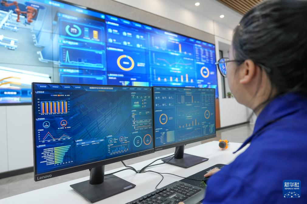 3月11日,技术人员在哈电集团哈尔滨电机厂有限责任公司线圈分厂数字化车间集控中心监视生产系统运行数据。