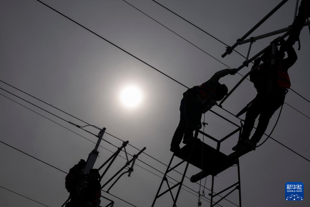 3月13日,工人在哈伊高铁绥化南站施工现场进行接触网作业。