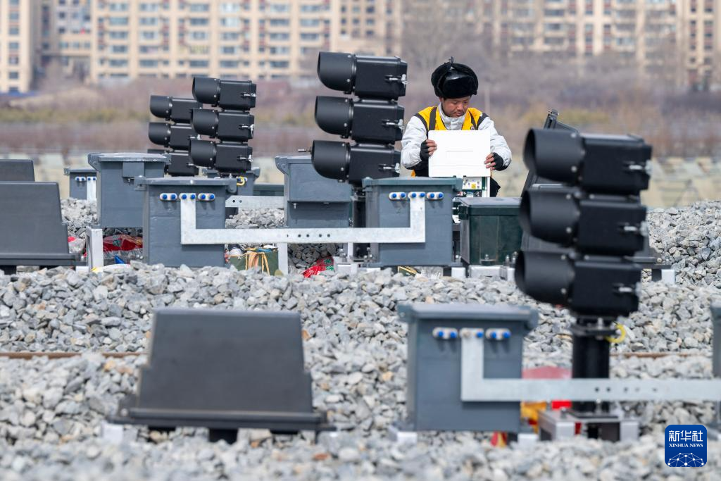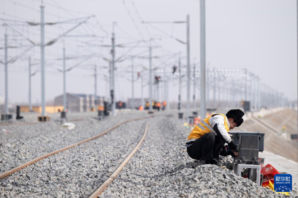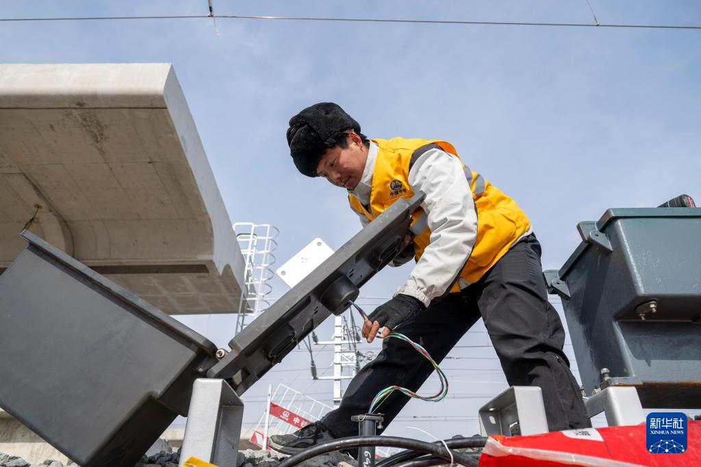 3月13日,工人在哈伊高铁绥化南站施工现场安装信号设备。