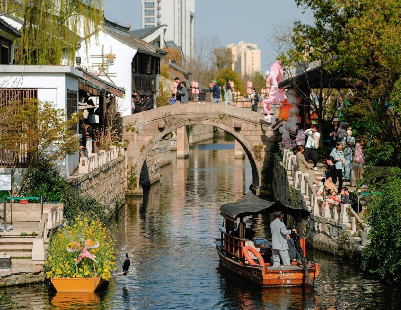 江苏南通通州区洲际梦幻岛内,层层叠叠的彩色花田顺着缓坡铺展,紫、橙、黄、粉等各色花卉交织成灵动的曲线纹样,宛如大地铺就的斑斓织锦,春日盛景尽收眼底。