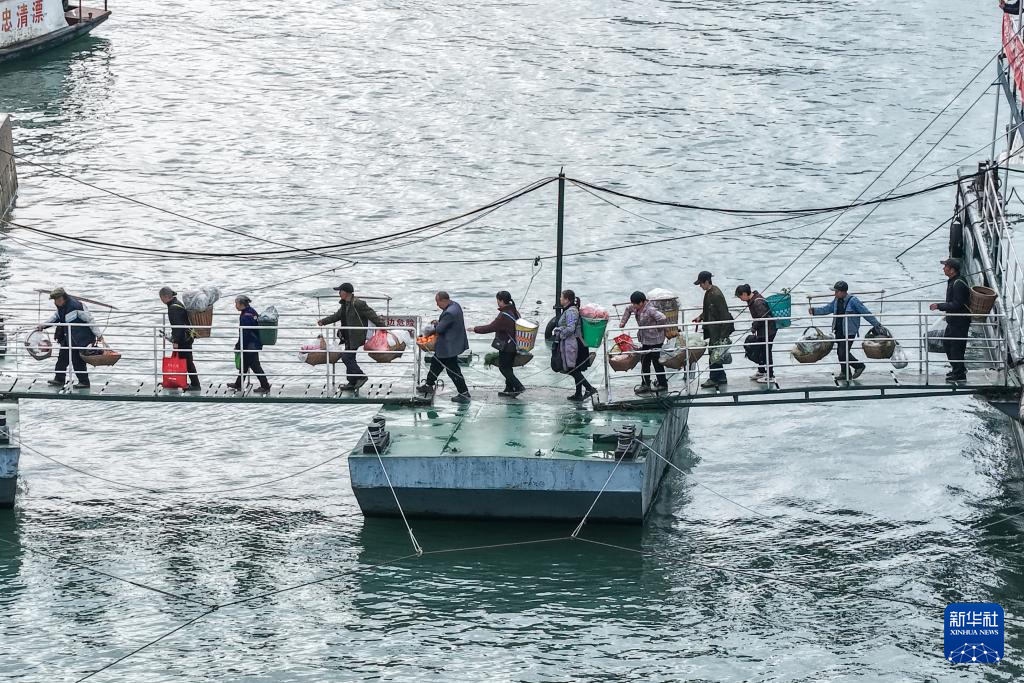 3月31日,在长江重庆忠县段,菜农登上“新渝忠客2180”客轮,准备前往县城西山码头(无人机照片)。
