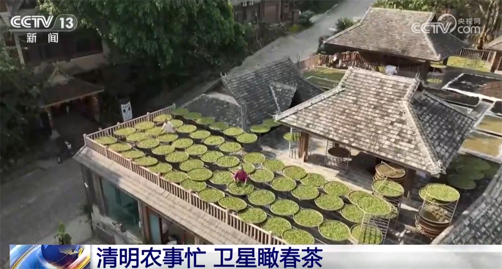 从云南普洱景迈山到福建武夷山燕子窠,再到四川雅安,一行行翠绿的茶树铺展在山坡上,茶农们穿梭于茶树间,娴熟地采摘鲜嫩茶青。茶园呈现出一派生机盎然的春茶采收景象。采摘后,茶农将新采的鲜叶铺展在传统民居的青瓦屋顶上,利用竹编簸箕进行晾晒。