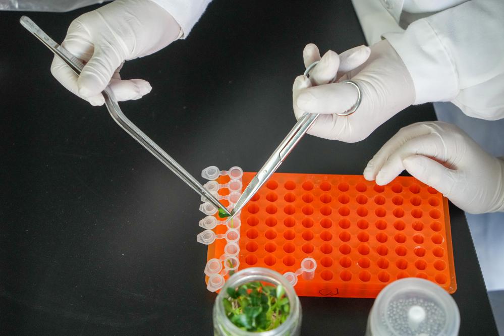 4月1日,寿光蔬菜种质资源库的工作人员在蔬菜种植苗圃提取植物样本。