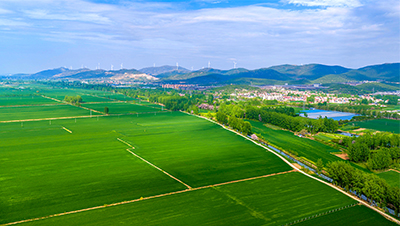 航拍安徽省淮北市杜集区梧桐村,错落有致的民居掩映在大片绿色田野中。