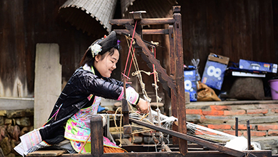 绣娘在贵州省黔东南苗族侗族自治州从江县丙妹镇岜沙苗寨进行苗布、苗绣非遗制作。